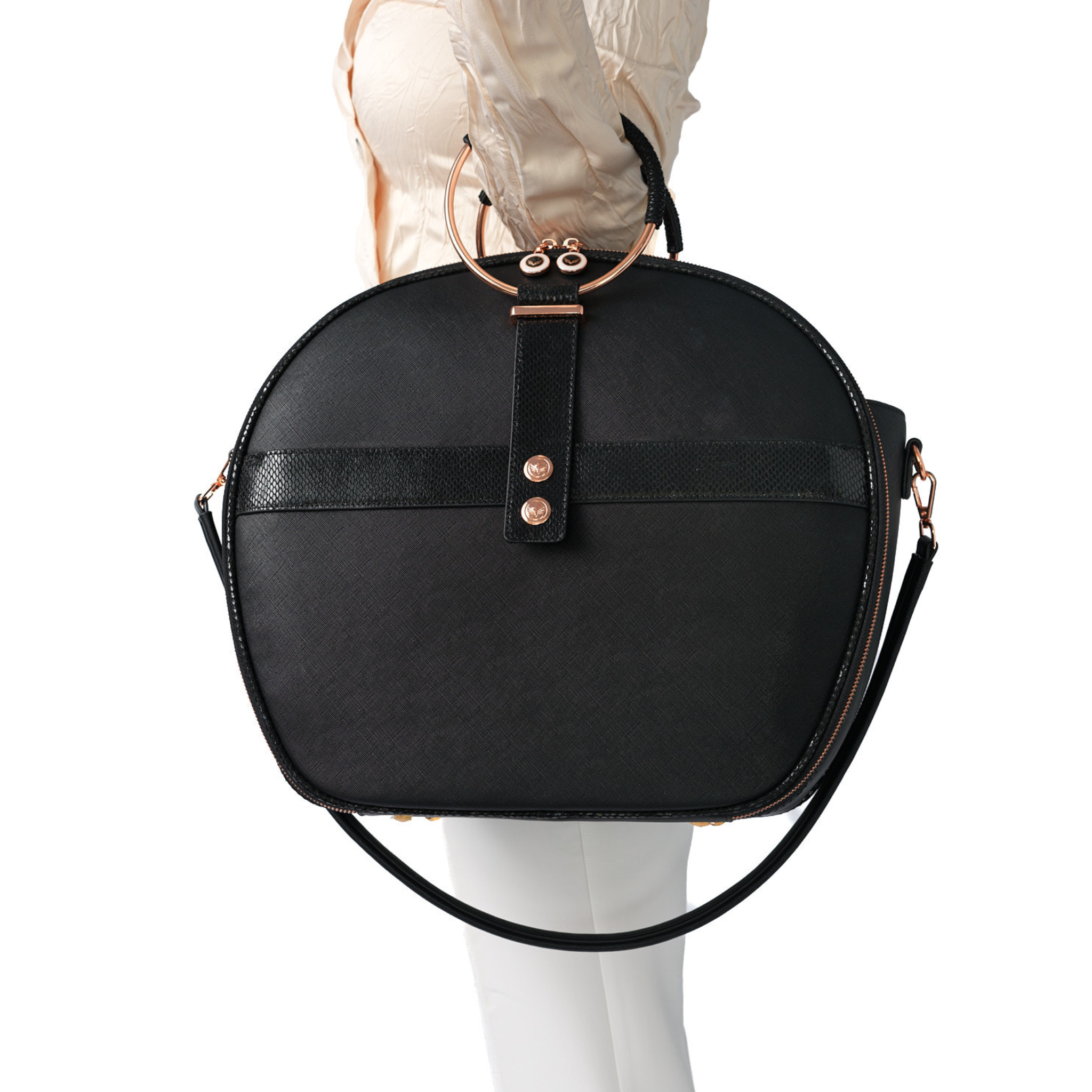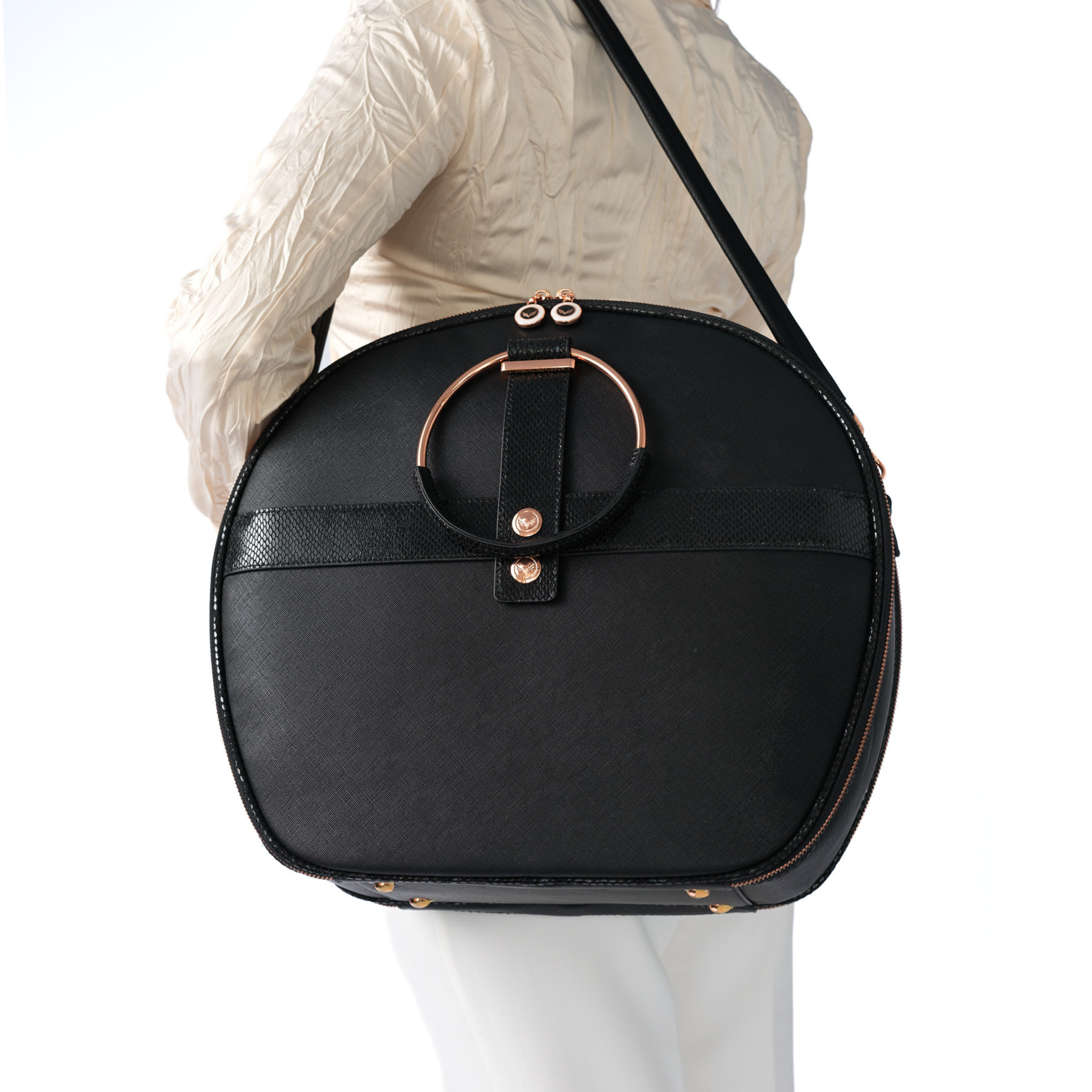A one-of-a-kind Birdy design where jewelry meets utility. Custom metallic handles that wear like bracelets wrapped in padded, exotic-embossed leather to soften the experience without compromising style. Offering two elegant carry options, slipping effortlessly over arm or resting comfortably in hand while elevating any look.